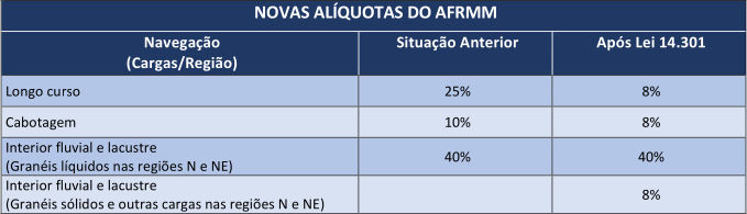 As alíquotas do AFRMM incidentes nas navegações de longo curso e cabotagem tiveram seus valores reduzidos para 8%.