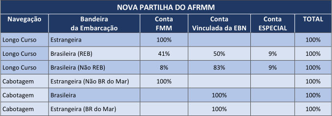 A partilha do AFRMM gerado pelas embarcações afretadas na forma prevista no BR do Mar passa a caber integralmente à conta vinculada da EBN e foi criada uma nova parcela de 10% dos recursos que cabem ao FMM para ser destinada anualmente ao Fundo Naval.