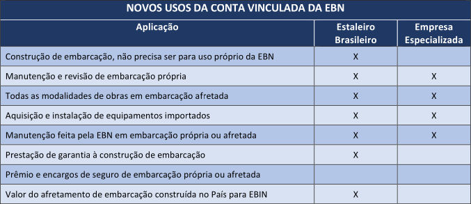 Entre os usos da conta vinculada da EBN foram incluídos ressarcir os custos de: obras em embarcações afretadas; serviços realizados por empresas especializadas (além de estaleiros); e manutenção realizada pela própria EBN. Outras possibilidades introduzidas para a utilização dos valores depositados na conta vinculada são: fornecer garantia financeira para a construção de embarcação em estaleiro brasileiro; reembolsar os valores de seguro das embarcações próprias ou afretadas; e pagar os valores de afretamento de embarcações de propriedade de EBIN construídas no País.
