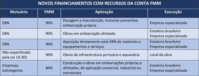 A Lei produziu quatro modificações nestes usos da conta FMM que tornam elegíveis para financiamento: obras de docagem e manutenção (inclusive preventiva); obras realizadas em embarcações afretadas; obras realizadas por empresa especializada; obras e serviços e aquisição de materiais e equipamentos quando contratados diretamente pela EBN.