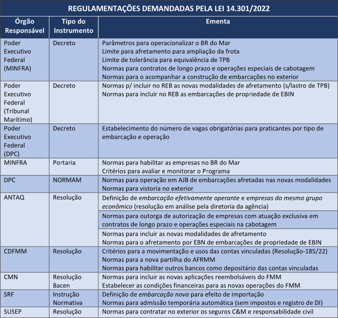Há instrumentos normativos citados expressamente na lei, mas há outros não mencionados, que ainda assim devem ser editados pelos órgãos encarregados para adequar o marco regulatório brasileiro às modificações introduzidas. Na esteira do decreto que regulamentará a Lei, o MINFRA e a Antaq têm papel fundamental a desempenhar. Ao primeiro cabe estabelecer, entre outras, a forma de concessão da habilitação e as competências para o estabelecimento das equivalências de TPB de embarcações. À Antaq cabe estabelecer os critérios para enquadrar a embarcação como efetivamente operante e pertencente a um mesmo grupo econômico e adequar suas normas de outorga e de fretamento às modificações trazidas pela Lei 14.301/2022.