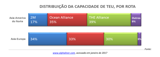 A 2M, constituída pelas duas maiores operadoras em termos de capacidade, a Maersk e a MSC, baseada em Genebra, já estava operando, enquanto a Ocean Alliance (CMA CGM/APL, COSCO, Evergreen e OOCL) e THE Alliance (Hapag-Lloyd/UASC, YML, NYK, MOL e KL) superaram a maior parte dos entraves regulatórios e começaram a operar em abril. Estas três alianças, formadas por 11 operadoras, vão manejar a maior parte dos contêineres das maiores rotas do comércio mundial.