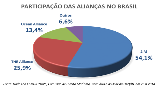 Também no Brasil, os processos de fusão e formação de alianças tiveram seus efeitos sentidos, levando a um número cada vez menor de empresas em operação. Além das alianças globais, que estendem sua operação para os portos nacionais, inúmeros anúncios de aquisições mostram que os estrangeiros vieram às compras no mercado brasileiro de transporte marítimo. Alguns exemplos são: a aquisição da Aliança Navegação pela Hamburg-Süd que, por sua vez, foi comprada pela Maersk (que já operava no Brasil com sua subsidiária a Mercosul Line); e a compra da chilena CSAV pela Hppag-Lloyd, que já era a dona da Libra Navegação.