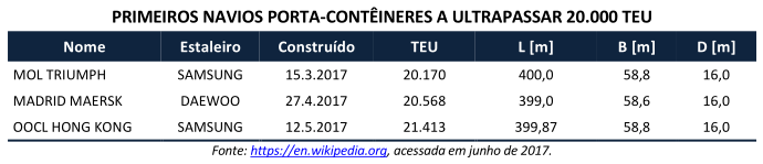 O ano de 2017 também está sendo marcado pelo crescimento da capacidade dos navios portacontêineres. Quando todos esperavam que os 18 mil TEUs dos navios da classe Triple-E não seriam superados, em apenas três meses o mundo testemunhou três quebras sucessivas do recorde de